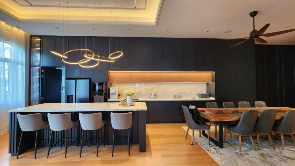 The kitchen in a Malaysian home is usually both functional and social. Good ceiling lights and under-cabinet LEDs provide the brightness needed for cooking while keeping the mood warm.